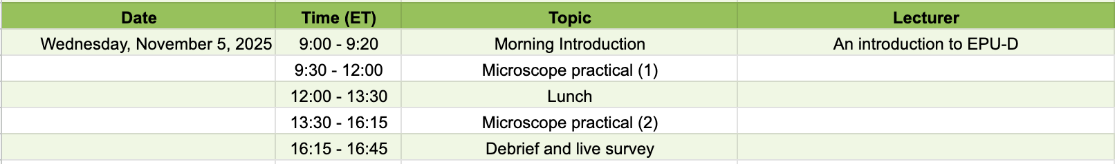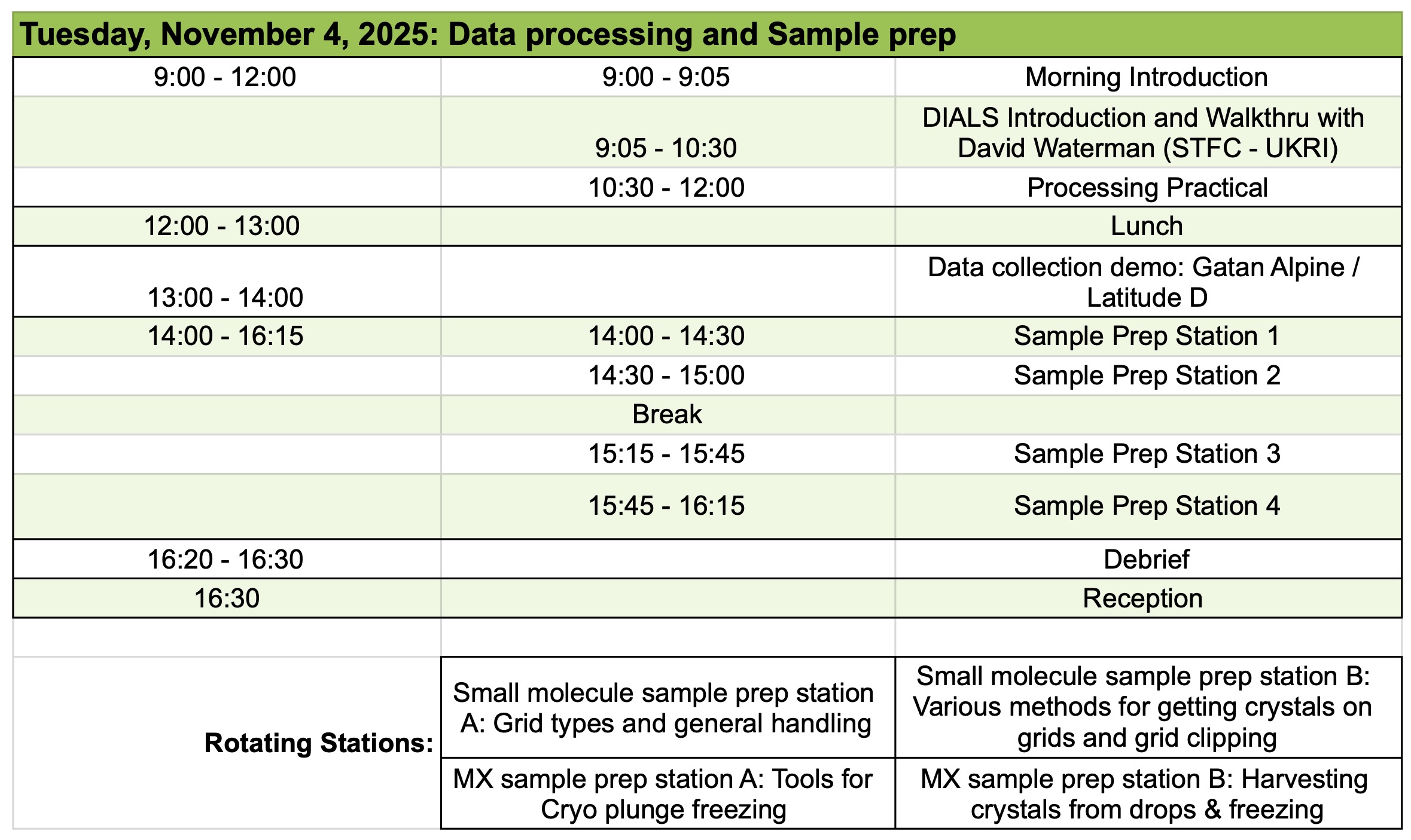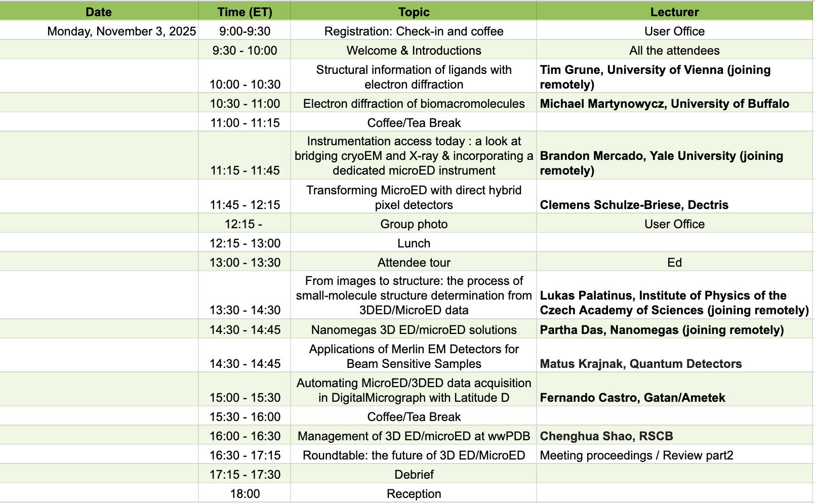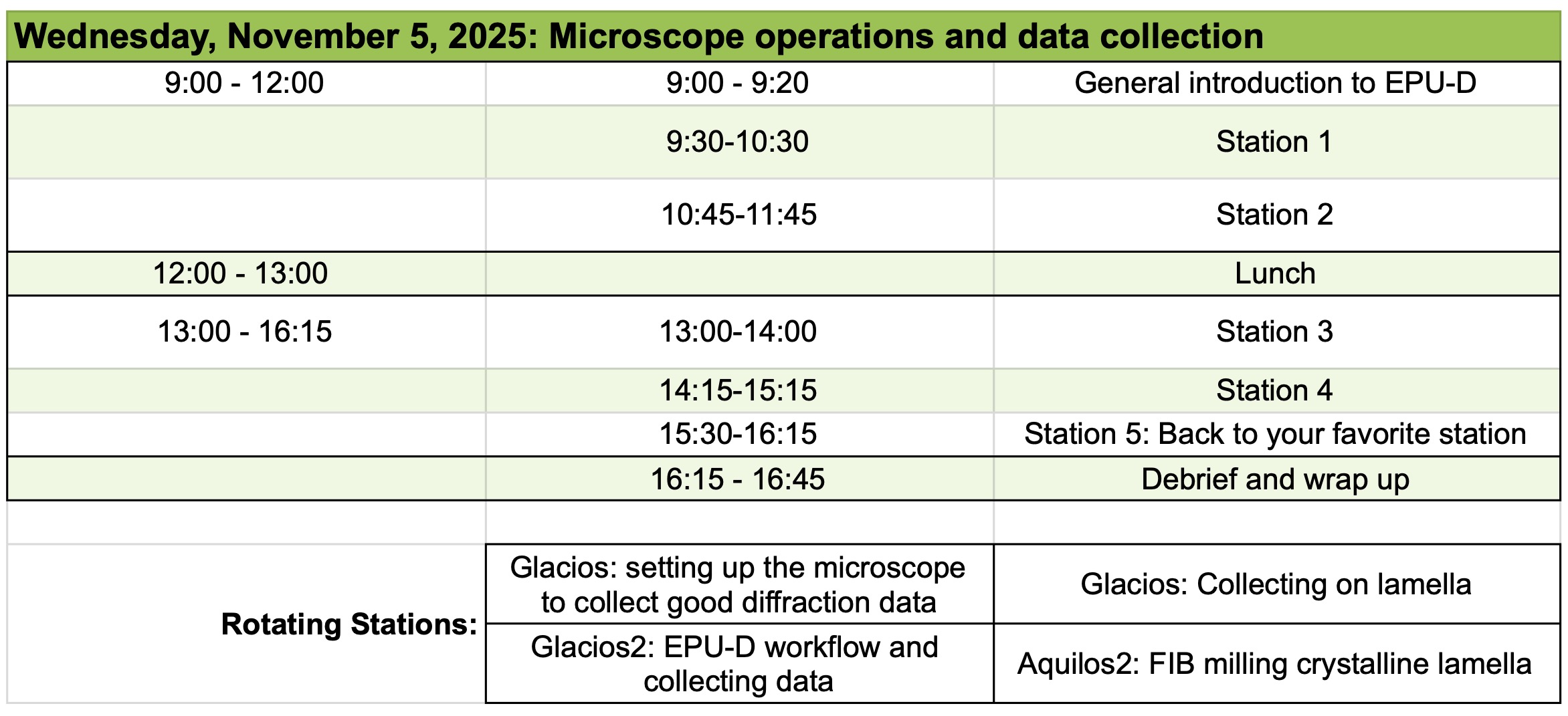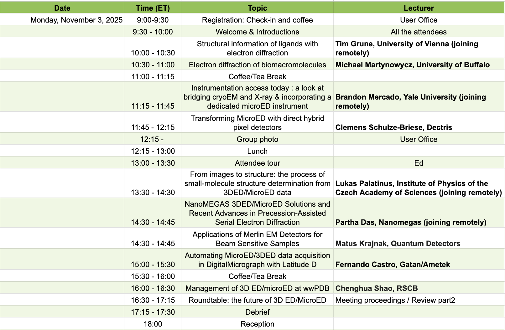 NYSBC, SEMC and NCCAT will offer a 3-day short course November 3-5. Day one of the course will encompass lectures that delve into the multiple steps of the MicroED workflow. Days 2 & 3 will have practicals in sample preparation, setting up a TEM for data collection, and data processing. For those that want further instruction and a chance to collect their own data, we will host a bonus day for independent practice on November 6. We held our first MicroED short course November 6-9, 2023 (https://nccat.nysbc.org/activities/courses/nccat-microed-2023/) for 18 participants that resulted in an Acta C review to help disseminate knowledge to the greater scientific community. Our second iteration November 4-6, 2024 built on lessons learned from the first workshop and further expanded the community of electron diffraction practitioners. This offering will be our third iteration that will be focused on advancing the field by creating sustainable communities of independent researchers.